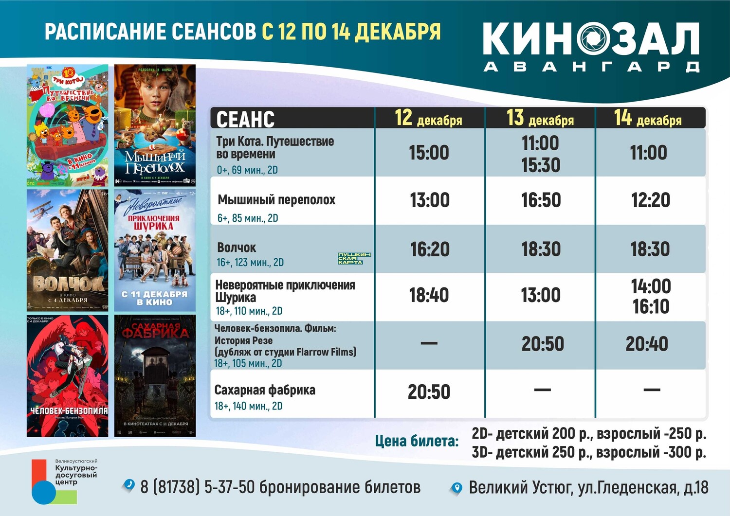 Купить билет можно через официальный сайт МБУК "Великоустюгский культурно-досуговый центр" кдцву.рф/ в разделе "КУПИТЬ БИЛЕТ В КИНО".