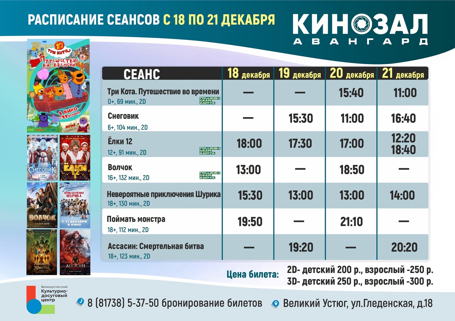 Купить билет можно через официальный сайт МБУК "Великоустюгский культурно-досуговый центр" кдцву.рф/ в разделе "КУПИТЬ БИЛЕТ В КИНО".
