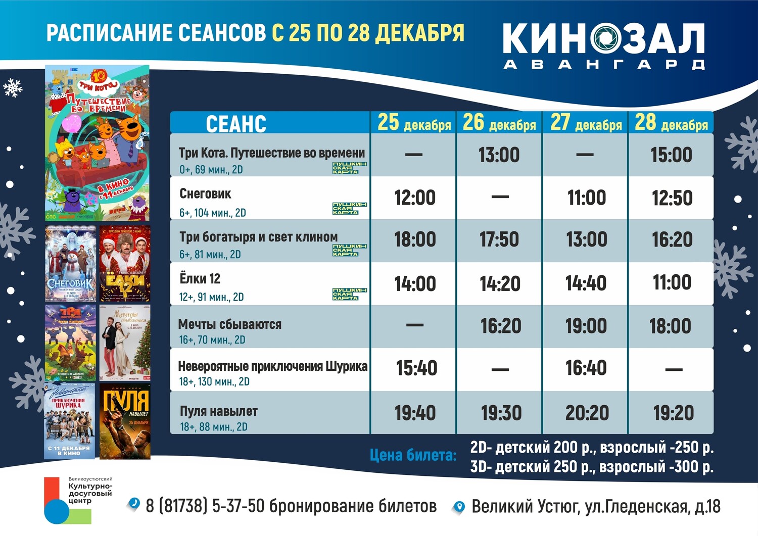 Купить билет можно через официальный сайт МБУК "Великоустюгский культурно-досуговый центр" кдцву.рф/ в разделе "КУПИТЬ БИЛЕТ В КИНО".