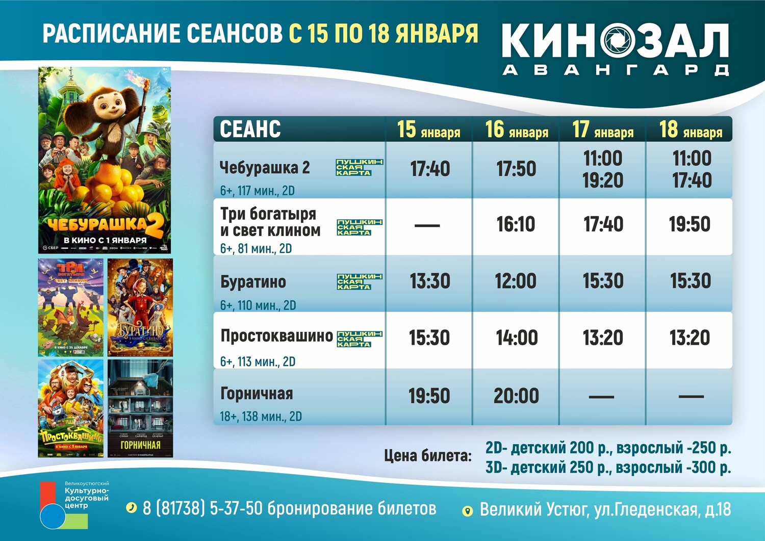 Купить билет можно через официальный сайт МБУК "Великоустюгский культурно-досуговый центр" кдцву.рф/ в разделе "КУПИТЬ БИЛЕТ В КИНО".