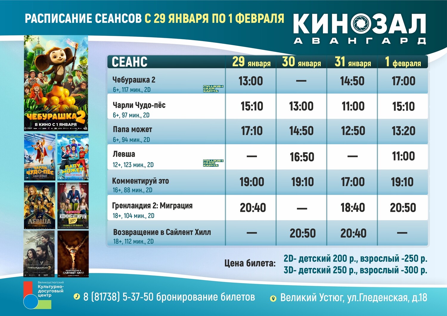 Купить билет можно через официальный сайт МБУК "Великоустюгский культурно-досуговый центр" кдцву.рф/ в разделе "КУПИТЬ БИЛЕТ В КИНО".