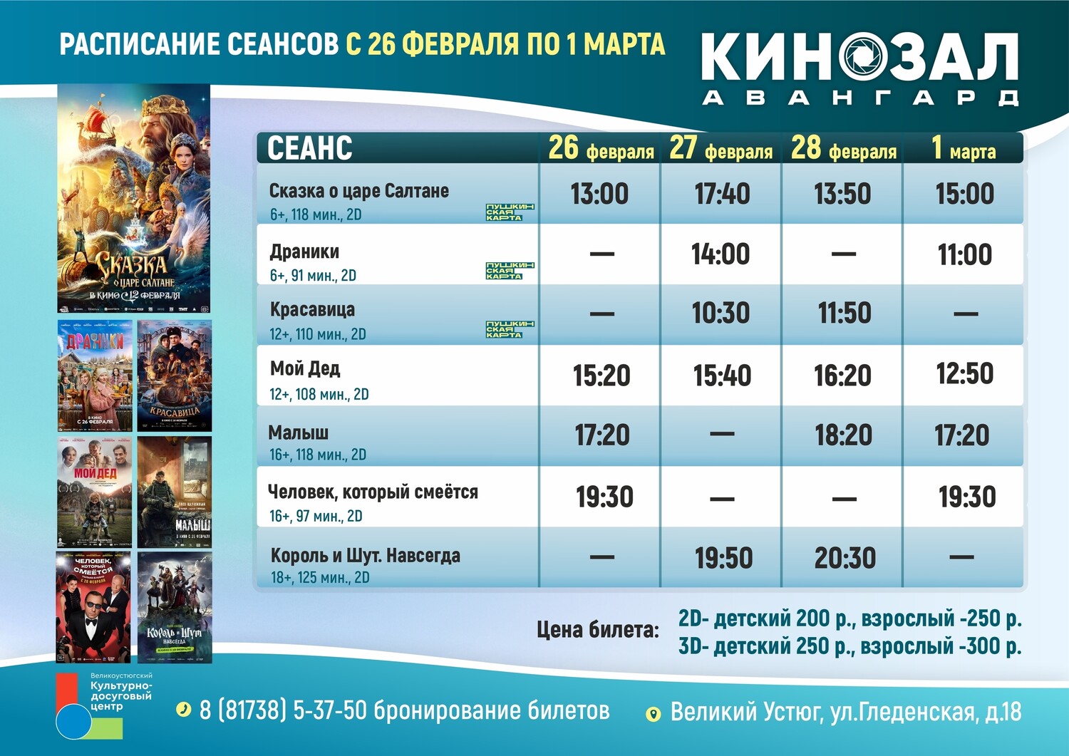 Купить билет можно через официальный сайт МБУК "Великоустюгский культурно-досуговый центр" кдцву.рф/ в разделе "КУПИТЬ БИЛЕТ В КИНО".