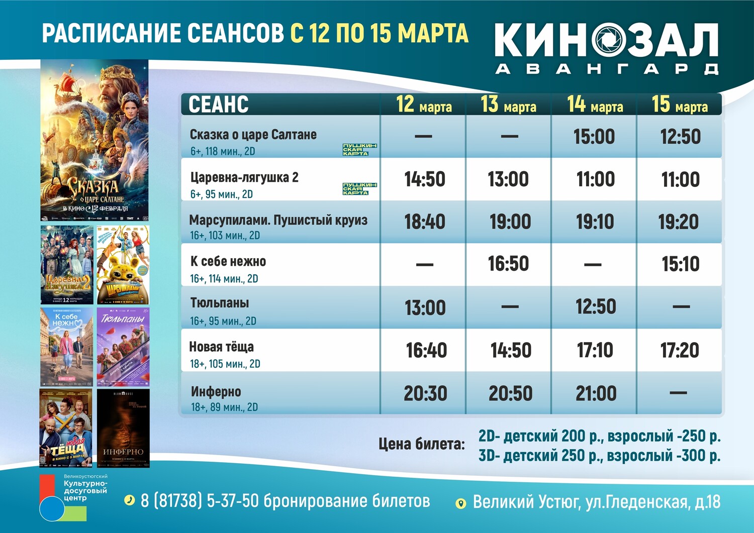 Купить билет можно через официальный сайт МБУК "Великоустюгский культурно-досуговый центр" кдцву.рф/ в разделе "КУПИТЬ БИЛЕТ В КИНО".