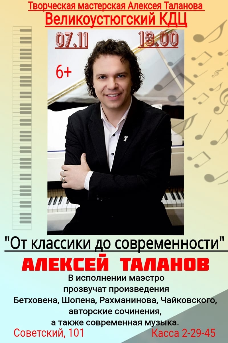 Уникальный вечер, где гениальный пианист и харизматичный певец объединятся в одном исполнителе. Маэстро Алексей Таланов представит две стороны своего таланта: виртуозное исполнение шедевров мировой классики и душевное прочтение популярных хитов.