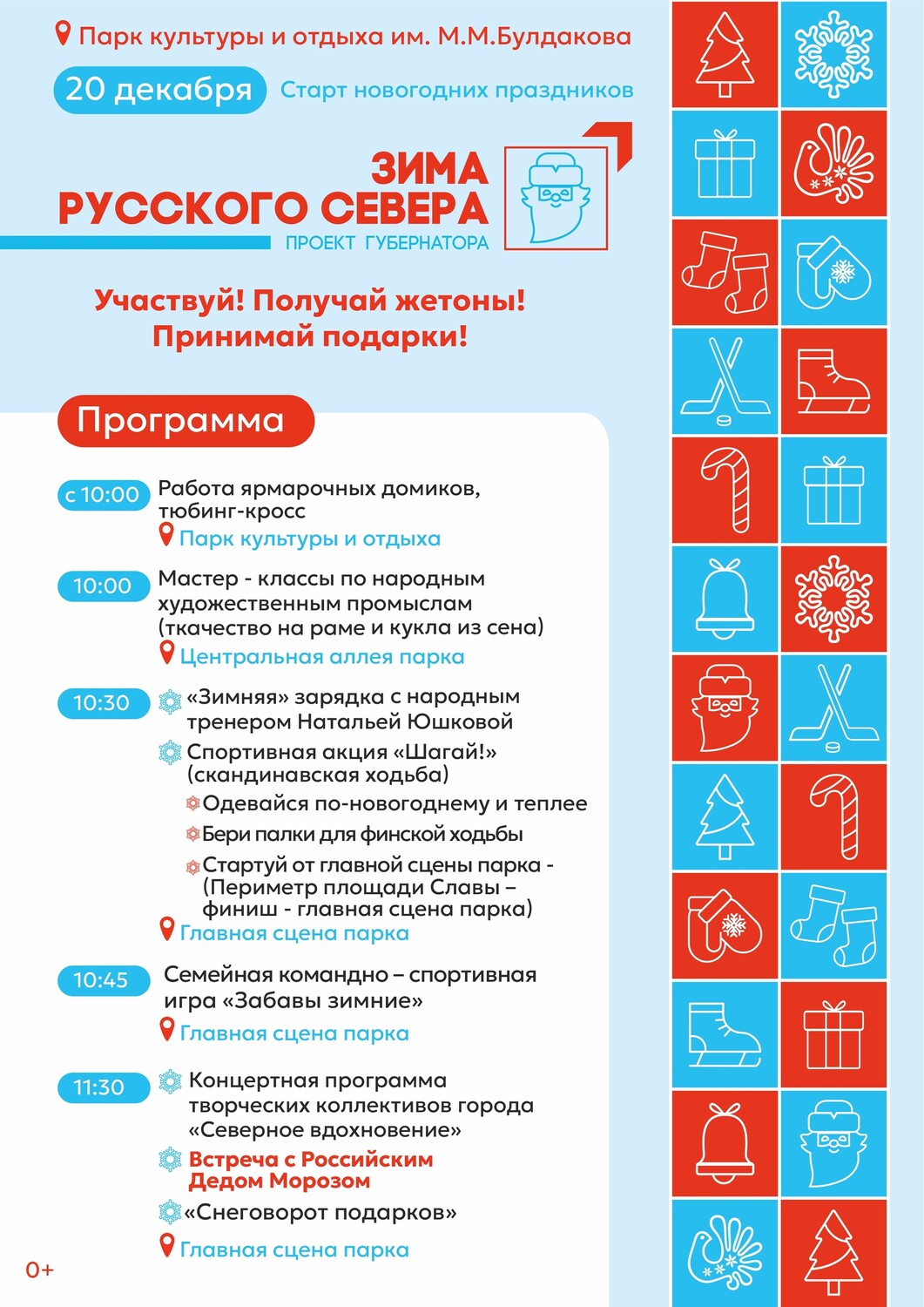 В рамках проекта губернатора «Зима Русского Севера» в парке пройдёт увлекательный семейный день — с мастер-классами, спортом, концертом и встречей с Российским Дедом Морозом!