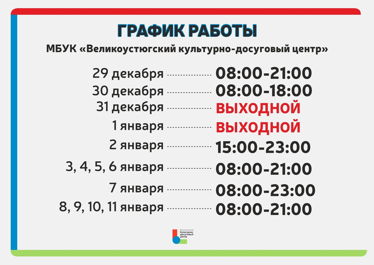 Важная информация перед каникулами! Уважаемые гости, друзья, участники и зрители! График работы Великоустюгского культурно-досугового центра и кассы в праздничные дни — особенный: мы хотим, чтобы вы могли спланировать свой визит без суеты и неожиданностей.