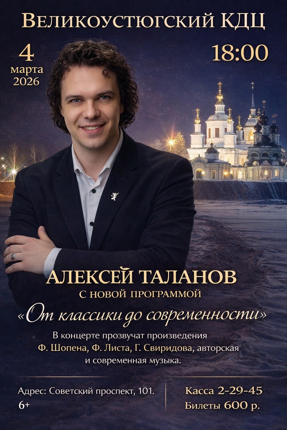 Вечер с маэстро Алексеем Талановым: от классики до современности — Шопен, Лист, Свиридов и авторская музыка в Великом Устюге.